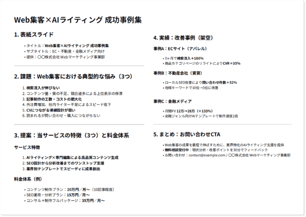 | 会社のWeb集客サービスをPRするための営業資料を作成してください。 【資料スペック】 タイトル:「Web集客×AIライティング 成功事例集」 想定クライアント:ECサイト・不動産会社・金融メディア 形式:PowerPoint的なスライド構成(5スライド程度) 【スライド構成】 表紙スライド 課題:Web集客における典型的な悩み3つ 提案:当サービスの特徴(3つ)と料金体系 実績:架空の改善事例(PV増加率、CVR改善など数値入り) まとめ:問い合わせCTA 【補足条件】 トーンは信頼感と親近感を両立 具体的な数値・実績を含める クライアント業界別のカスタマイズ例を示す |