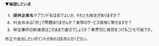 アウトプットのあとにGPTsから、追加で質問される場合があるので、変更したい点があれば要望を伝えましょう。