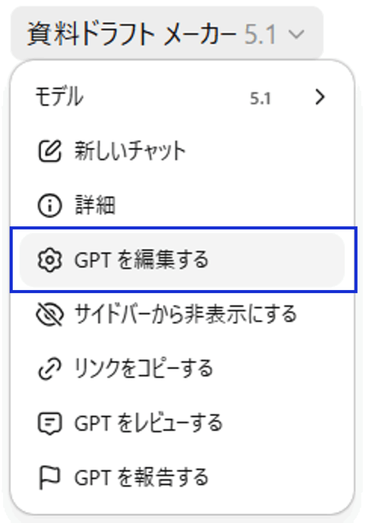 GPTsは、作成して保存したあとでも、指示文やインプットするデータを調整できます。画面上部にあるGPTsのタイトルをクリックし「GPTを編集する」を選びましょう。