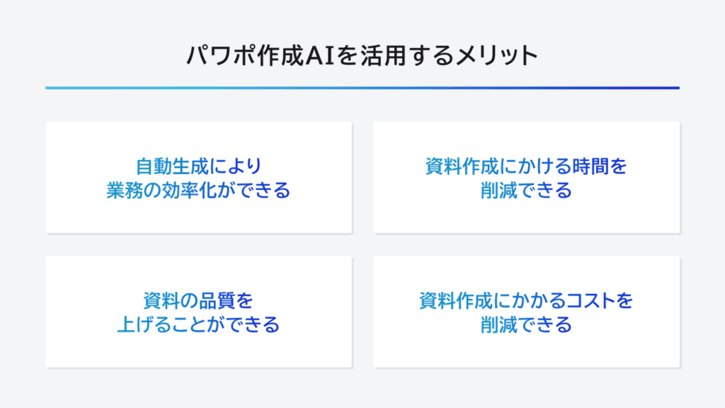 AIを使ってパワポ資料を作成することで、作業効率やアウトプット品質の向上が期待できます。ここでは、パワポ作成AIツールを導入する主なメリットを整理します。